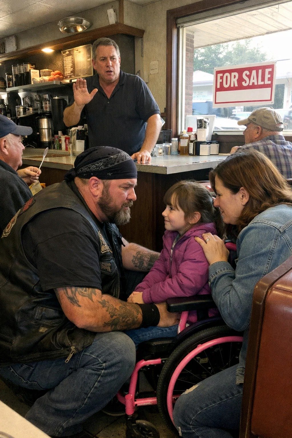 “They Won’t Let Me Eat,” a 5-Year-Old Girl in a Wheelchair Whispered — So the Biker Made One Phone Call, Bought the Diner That Same