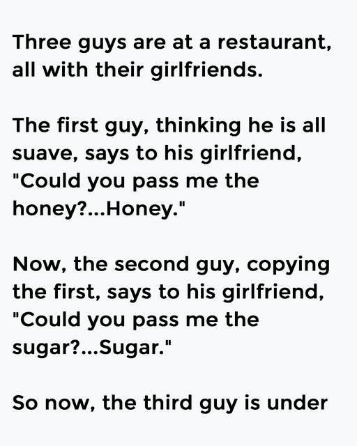 The small restaurant buzzed with the quiet rhythm of dinner conversation, clinking glasses, and the aroma of warm bread drifting through the air. At a corner table, three friends sat with their girlfriends, enjoying what was meant to be a relaxed evening out. The first man, confident and charming, leaned toward his girlfriend with a playful smile. “Could you pass me the honey, honey?” he asked. She laughed softly and handed the jar across the table. His friends grinned, impressed by the smooth delivery. It was harmless, sweet, and earned him an approving nod from the group.