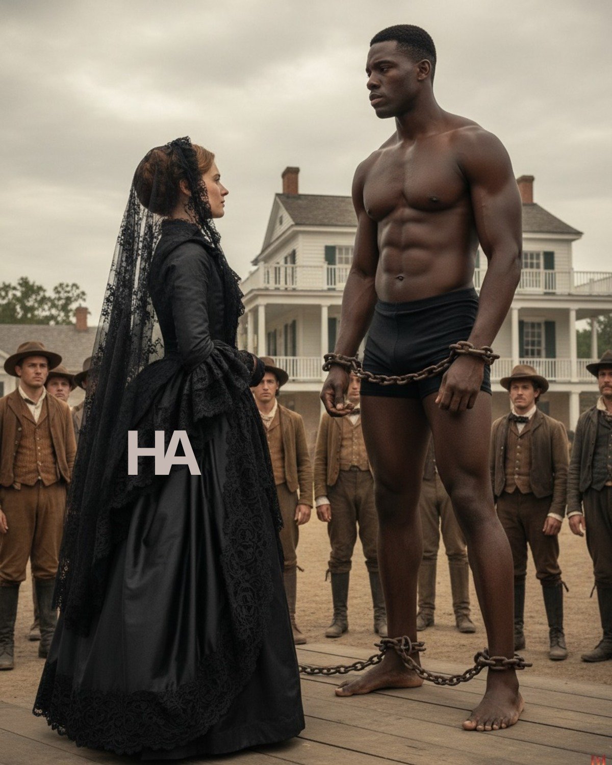 He is tall, skin browned by sun rather than weakness, and he holds himself like the chains are an inconvenience rather than a verdict. It isn’t beauty in the polite sense that hits you, not a salon portrait kind of beauty, but a presence that refuses to shrink. His face is carved harder than the others, jaw set, eyes dark and alive, the kind of eyes that ask questions even when silence is safer. You’ve seen proud men before at dinners and in church, men with soft hands and loud opinions. This pride is different, quieter, more dangerous, because it doesn’t need witnesses. When he lifts his gaze and meets yours, the world narrows, and you feel an odd, sharp knot under your ribs. He doesn’t look away, not even when your status should make him. That single refusal unsettles you more than any pleading would, because it reminds you of something you’ve tried not to name: that he is a man, not a thing. In that moment you become aware of your own breath, your own heartbeat, your own complicity. You look down first, and it annoys you that you do.
