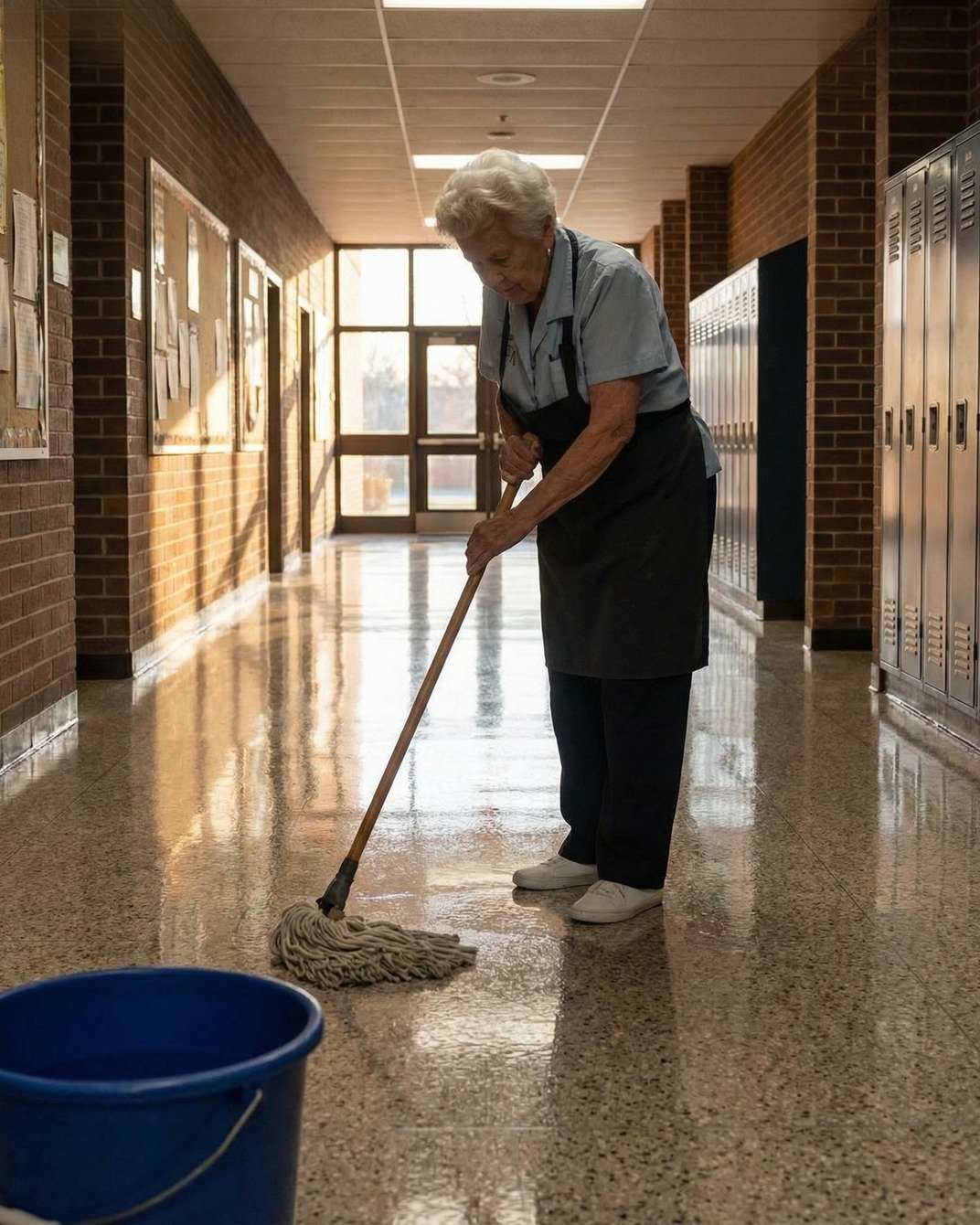 I was finishing my nightly rounds at the school when a sound stopped me cold—soft crying coming from the girls’ restroom long after the last bell. I didn’t rush in or demand answers. I simply let her know someone was there. A teenage girl slowly opened a stall door, eyes swollen from tears, insisting she was “fine” even though everything about her said otherwise. I sat down on the cool tile floor, my mop leaned against the wall, and told her she didn’t owe me an explanation. After a long silence, the words finally came. She talked about feeling judged, laughed at, and unseen, as if she didn’t matter at all. I listened. I didn’t interrupt. I reminded her—quietly and sincerely—that her value wasn’t decided by the people who failed to understand her. When she left, she whispered a thank-you so small it almost disappeared, but it stayed with me all night.
