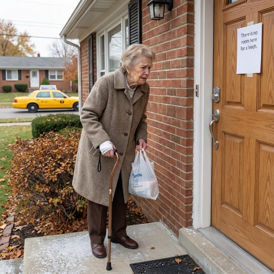 The taxi driver hesitated before pulling away from the curb. He looked in his rearview mirror at the elderly woman standing on the sidewalk, leaning heavily on a cane, a small hospital bag at her feet.