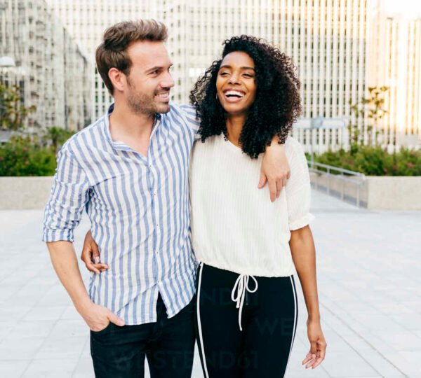 Cheerful black woman and Caucasian man hugging and laughing while walking on city street together