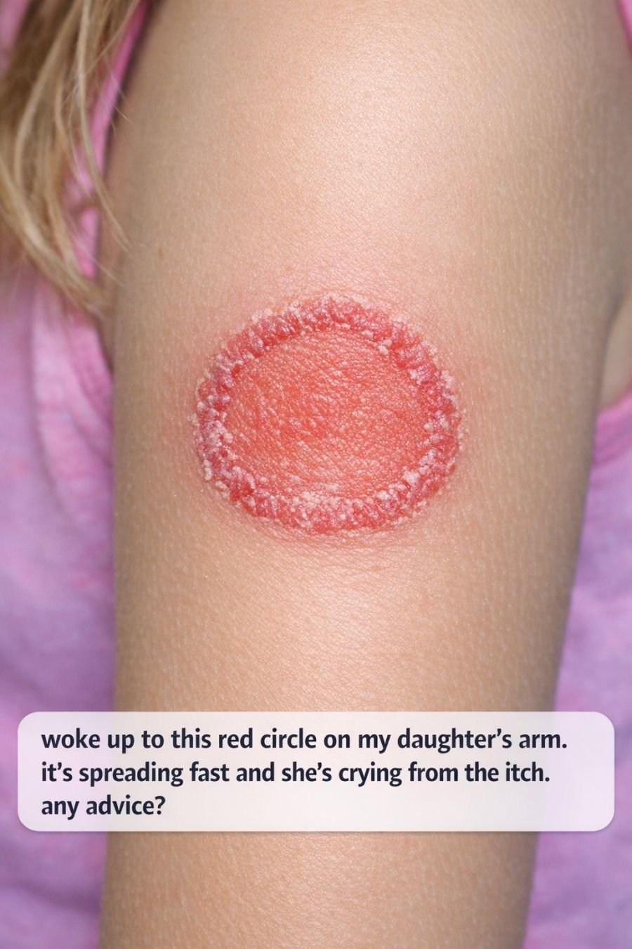 woke up to this red circle on my daughter’s arm. it’s spreading fast and she’s crying from the itch. any advice?.