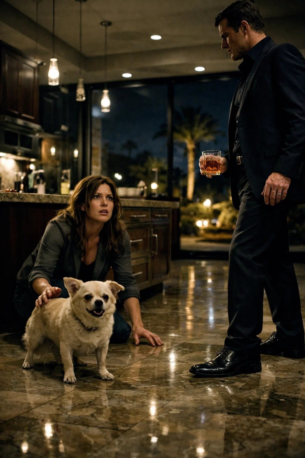 A tiny cream-colored dog came scrambling from the hallway, paws skidding on the tile, body shaking but determined. His name was Nico, and he weighed less than a grocery bag, but he planted himself between Victor Hale and the woman who fed him.