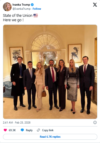 Shortly before the speech, Ivanka Trump posted a group photograph on X featuring herself and several members of the Trump family.