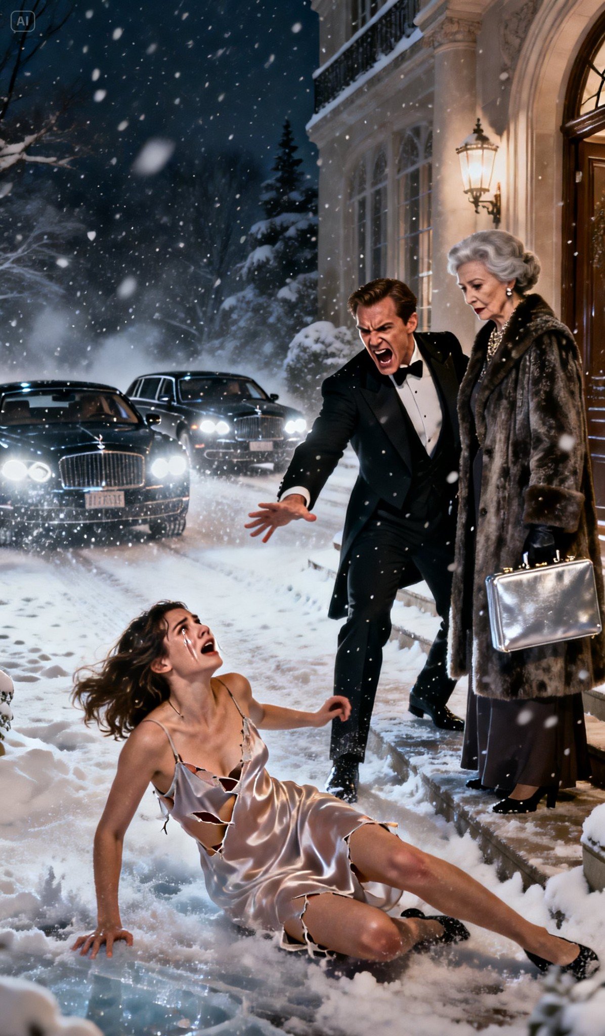 After my husband ripped my clothes and threw me into the street in the dead of winter, his mother leaned in with a cruel smile and sneered, “Let’s see if any beggar will pick you up.” I stood there shaking, humiliated—until I made one phone call. Thirty minutes later, engines rolled down the block, headlights cutting through the cold, and a line of Rolls-Royces pulled up like a final verdict.