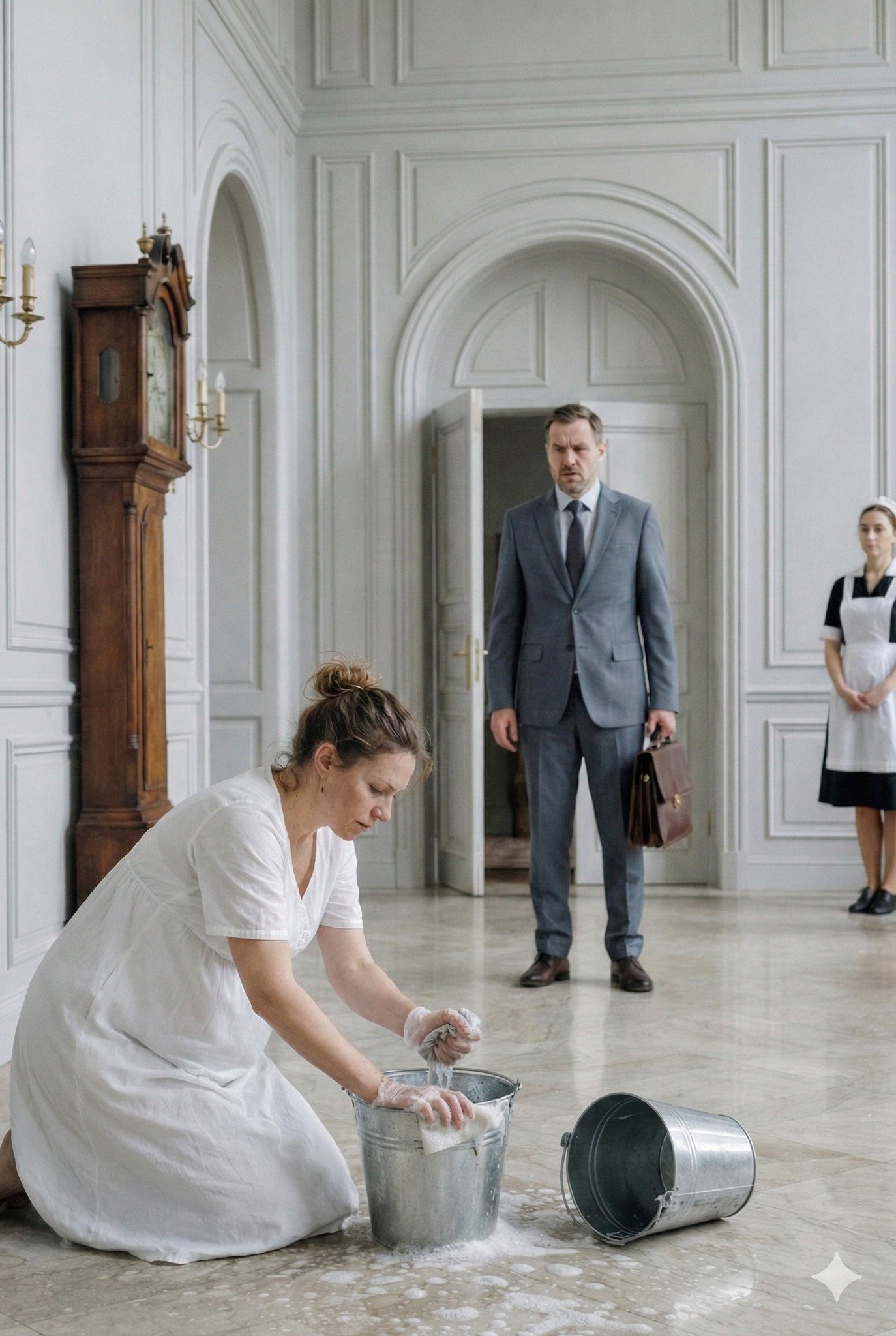 I returned home early to surprise my wife, eight months pregnant, and instead found her on her knees scrubbing the floor while my staff looked