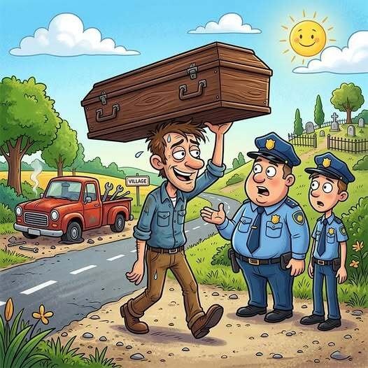A man who makes coffins was on his way to deliver one of his coffins when his car broke down. Trying not to be late, he put the coffin on his head and began heading to his destination. Some policemen saw him & wanted to make some money off him, so they challenged him, “Hey, what are you carrying and where are you going?”