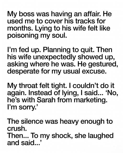 Then one afternoon, she walked into the office. My phone buzzed instantly—Richard telling me to repeat the same lie. I had done it so many times before. The words were ready. But this time, something in me refused.