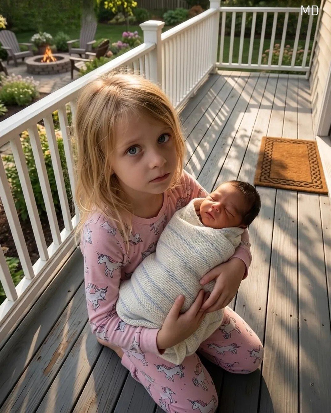 The morning had begun with simple comforts—the warm scent of breakfast, the quiet rhythm of a weekend, and the sense that everything in my life was steady. That illusion shattered when my eight-year-old daughter, Talia, burst through the back door, barefoot and trembling, holding a newborn baby in her arms. Her face was pale with fear as she clutched the tiny bundle, and before I could even process what I was seeing, she looked at my husband and said she had watched him place the baby outside. In that instant, the calm of our home dissolved into confusion and urgency, replaced by the fragile cry of a child who needed help.