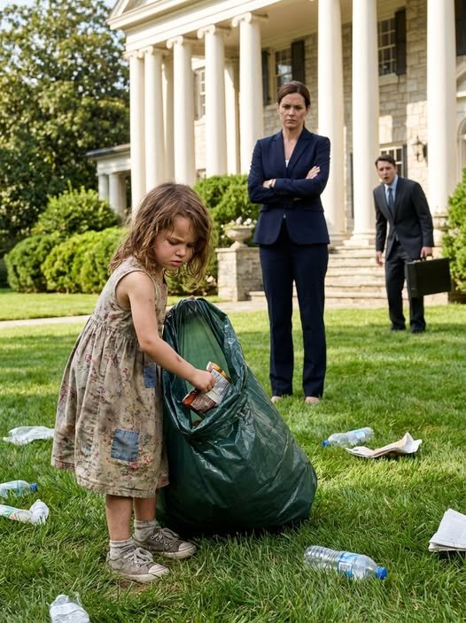 Hannah stood in the yard, dragging a trash bag nearly as big as she was. Her arms trembled. Her clothes hung loosely. Her small body strained with effort.