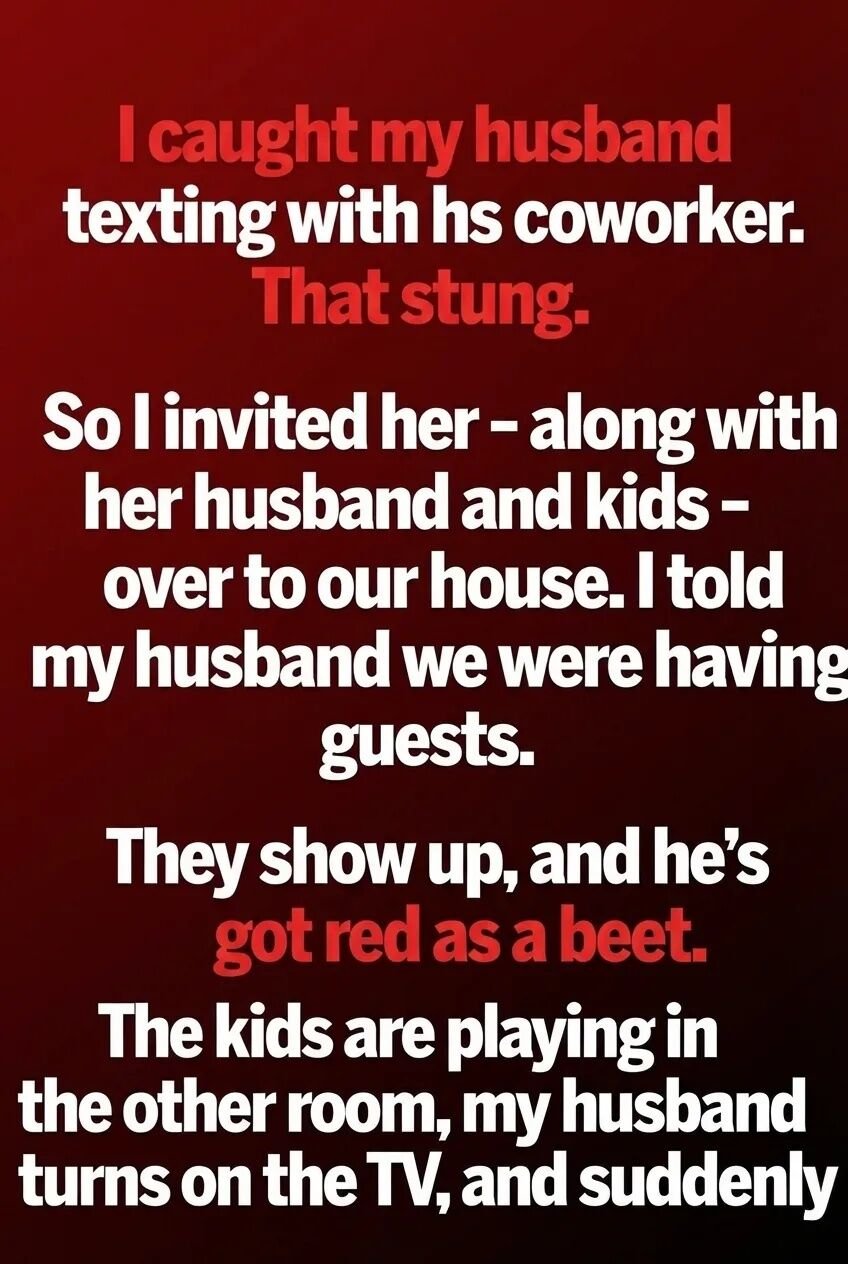 I caught my husband texting with his coworker. That sting lingered, and instead of letting it fester, I decided to confront the tension in an unusual way—I invited her, along with her husband and kids, over to our house. When I told my husband we were having guests, his face turned red as a beet.